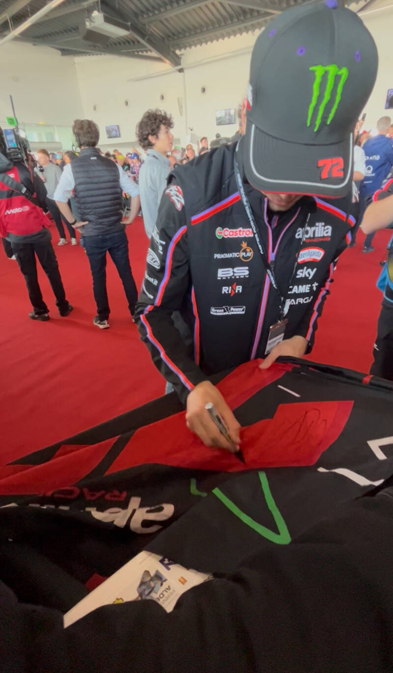 I think we just about got a photo and signature of everyone other than Diggia who wasn't there to my disappointment or Alex Marquez and worst of all Fabio. Safe to say that Sophie was devastated by the end of the weekend and I had no idea what I could do. But the greatest thing from my part was seeing Bez once again, recognising me from Thursday and getting a final signature on my flag. I hate to be that person but I do think he was happy to see us again. To our surprise, we were able to get a photo with Marc considering this was impossible with our paddock passes and was comforting that he came over to see everyone. At least I was able to come away with my Lenovo jacket being signed by Pecco Bagnaia too. 20 minutes and the chaos is all of a sudden over and it was time to try and take a 25 minute trip back to our seats to watch Moto2. This instead took us about 45 minutes and we only got to watch half of the race, something irritating as I love Moto2 but I wouldn't pass on the Hero Walk next year.
